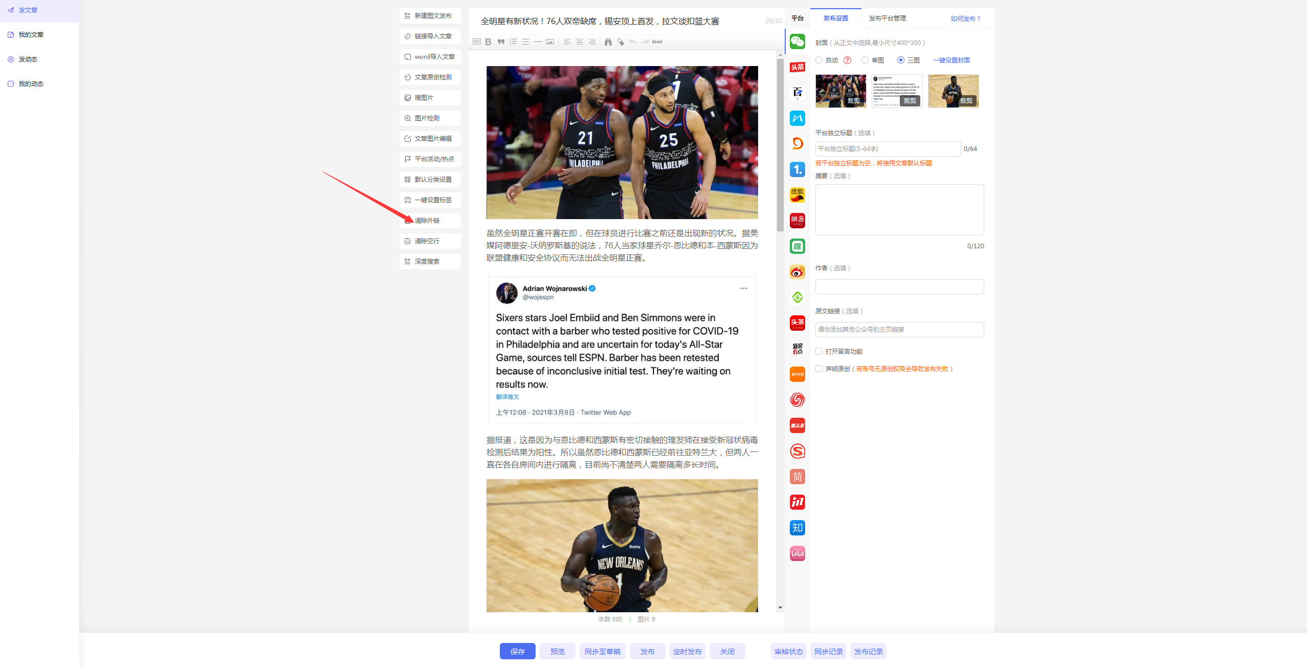 澶存潯鏂囩珷鍙戝竷鍐呭涓笉鍏佽娣誨姞鍏跺畠騫沖彴閾炬帴錛屾偍鍙互閫氳繃鍔╂墜鐨勬竻闄ゅ閾懼姛鑳芥潵鍒犻櫎錛岃涓嬪浘,娓呴櫎鎴愬姛鍚庣偣鍑繪枃绔犱繚瀛樻寜閽紝鐒跺悗鍒板悓姝ヤ腑蹇冮噸璇曞嵆鍙?