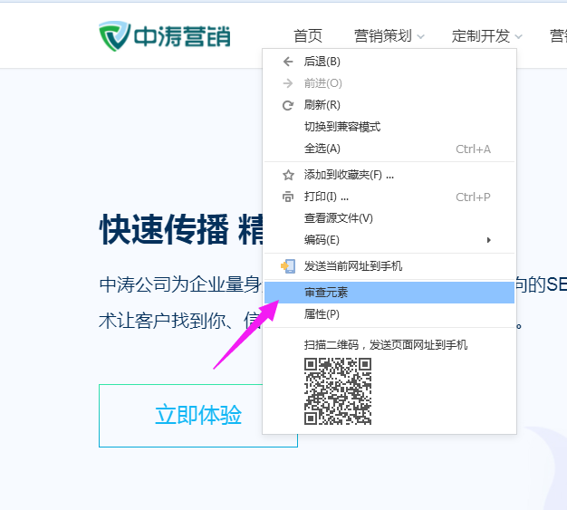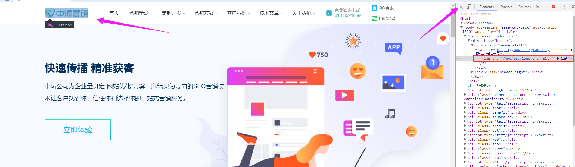 就以本網(wǎng)站:www.zhongtao.net為例,假如說想要對網(wǎng)站更換logo樣式,先要打開網(wǎng)站,然后點(diǎn)擊鼠標(biāo)右鍵,選擇審查元素。網(wǎng)站頁面會出現(xiàn)一個審查元素框框,點(diǎn)擊左上角小鼠標(biāo)樣子的地方,然后點(diǎn)擊選擇網(wǎng)站logo,這時審查元素的框框內(nèi)就會顯示出來。