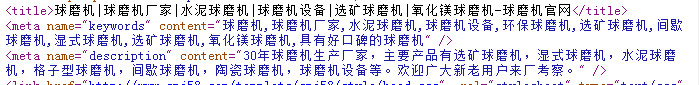 網站的TDK是應該網站的重中之重,網站的TDK能決定網站長期發展排名情況,剛接到站的時候,網站TDK設置非常不合理,標題只有“球磨機廠家”,關鍵詞和描述都只是“球磨機”,這是非常不合理的,在跟客戶進行溝通后,我們對網站的TDK進行了重新編輯填充。