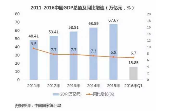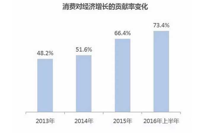 從 宏觀大環境來看,2016 年國民經濟延續 2015 年的中高速增長,GDP 增速難以逾越 7% 大關。與此同時,消費占經濟增長的比率逐年提升,2016 年上半年達到 73.4%,成為經濟增長的重要引擎。在經濟進入中高速增長的新常態下,供給側改革創新與居民消費升級的趨勢顯現。