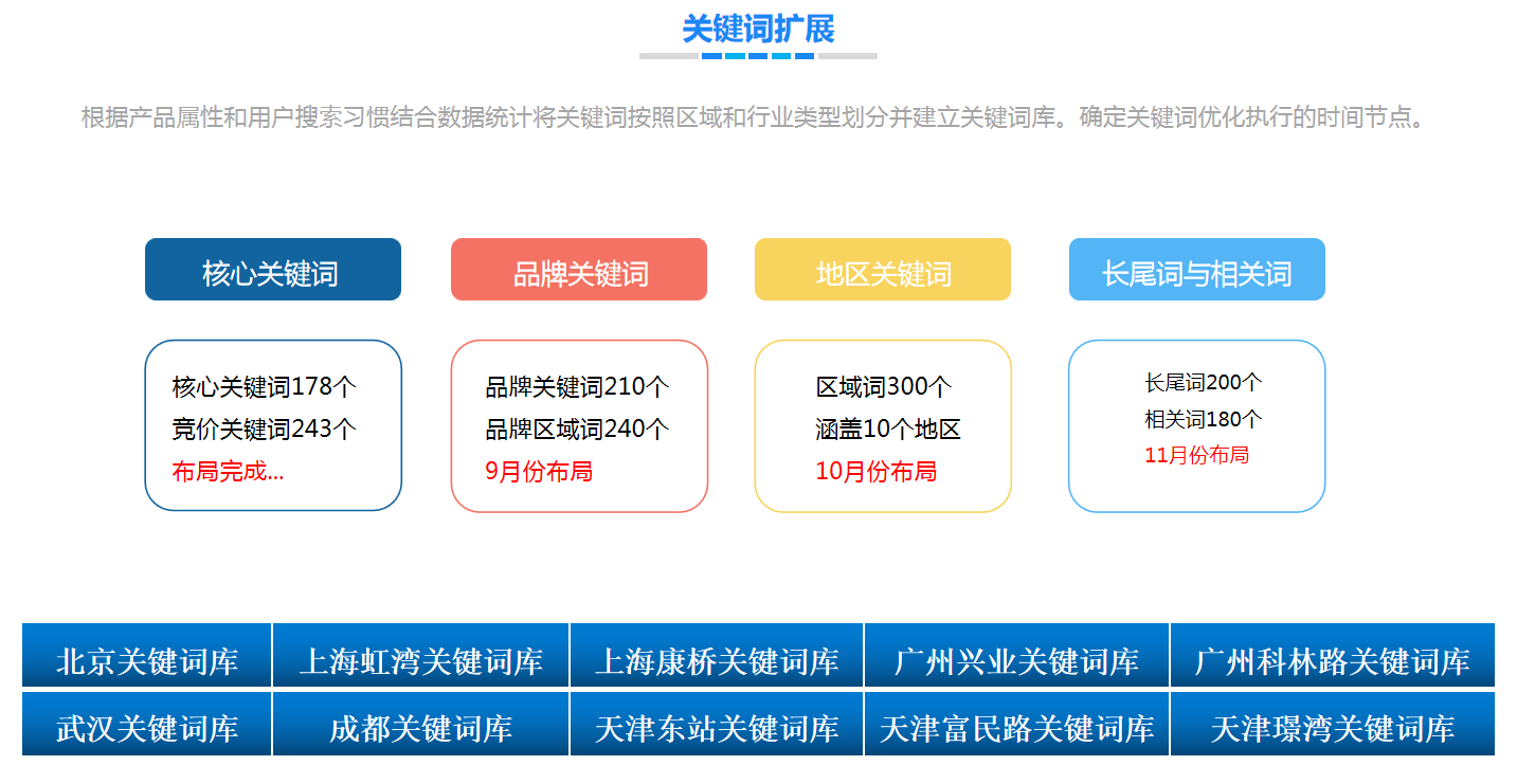 鏍規(guī)嵁浜у搧灞炴у拰鐢ㄦ埛鎼滅儲涔?fàn)鎯l撳悎鏁版嵁緇熻灝嗗叧閿瘝鎸夌収鍖哄煙鍜岃涓氱被鍨嬪垝鍒嗗茍寤虹珛鍏抽敭璇嶅簱銆傜‘瀹氬叧閿瘝浼樺寲鎵ц鐨勬椂闂磋妭鐐廣?